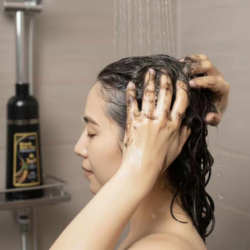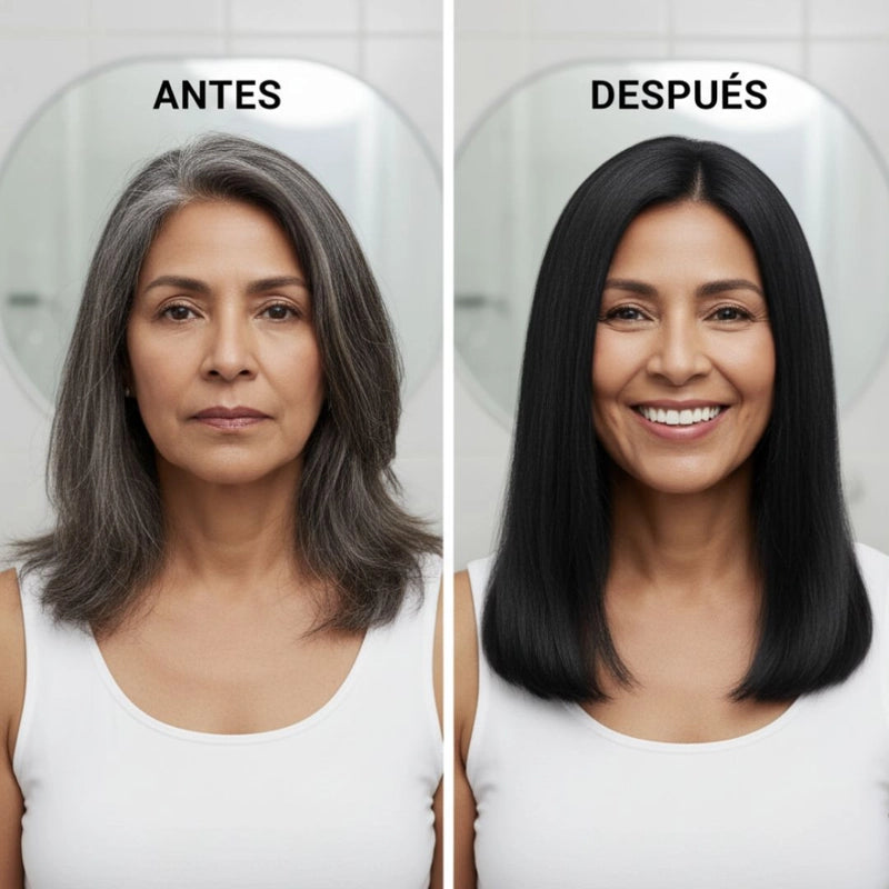 Es tan fácil como usar tu champú habitual. Solo aplica, espera unos minutos y enjuaga. ¡Verás cómo tus canas desaparecen revelando un negro intenso y uniforme!